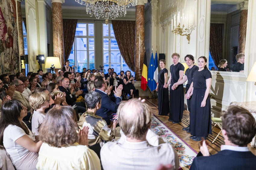 Cette année, la soirée France Alumni Belgique a mis à l’honneur l’excellence française dans l’enseignement des arts théâtraux -arts où le pays de Molière occupe une place singulière-, en partenariat avec la prestigieuse école du Cours Florent et de son campus bruxellois. Des alumni belges du Cours Florent ont orchestré une représentation théâtrale en suivant le concept de théâtre à la demande. Dans cette formule originale, le public tire au sort les rôles et situations, offrant aux comédiens un défi improvisé à relever sur scène. Une manière à la fois interactive et ludique de vivre le théâtre, mais aussi un bel exemple de coopération franco-belge puisque la compagnie 7 ans plus tard, à l’origine du concept et d’où sont issus les acteurs, est basée dans les Hauts-de-France et emploie des artistes des deux côtés de la frontière.